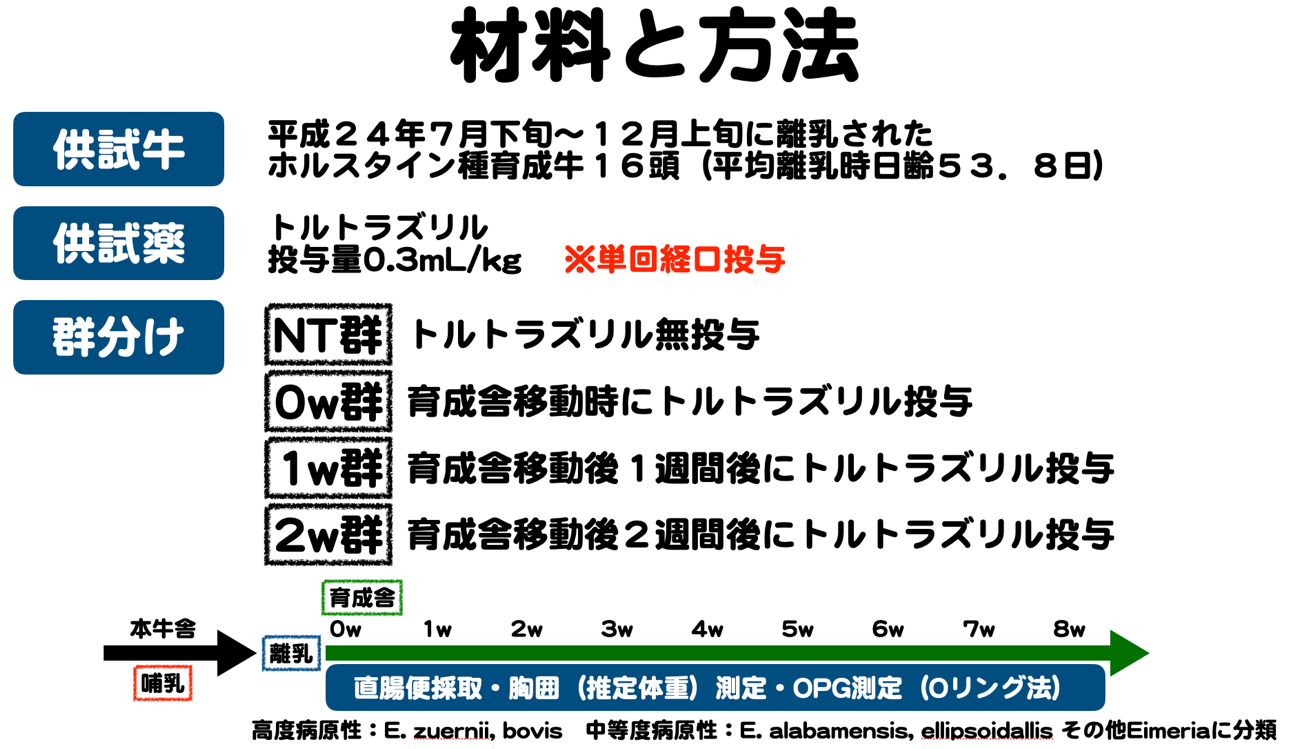 抗コクシジウム薬の投与タイミングを、育成舎移動後0週(移動直後:0W群)、1週(1W群)、2週(2W群)に設け、無投与(No Treatment:NT群)含め計4群、各群4頭の計16頭の育成牛を供試し、各々移動直後から8週目まで1週間ごとに9回、胸囲(推定体重)の測定と糞便中のオーシスト数(OPG)を測定しました(図1)。