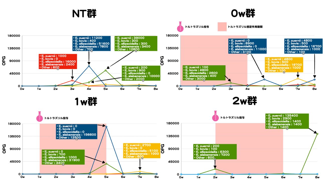 各群の4頭のOPGの推移は、それぞれ異なる色の折れ線グラフで表しています。ピンク色の三角形はトルトラズリル製剤の作用期間を指します。色のついた四角には検出されたオーシストの種類と数を示してあります。