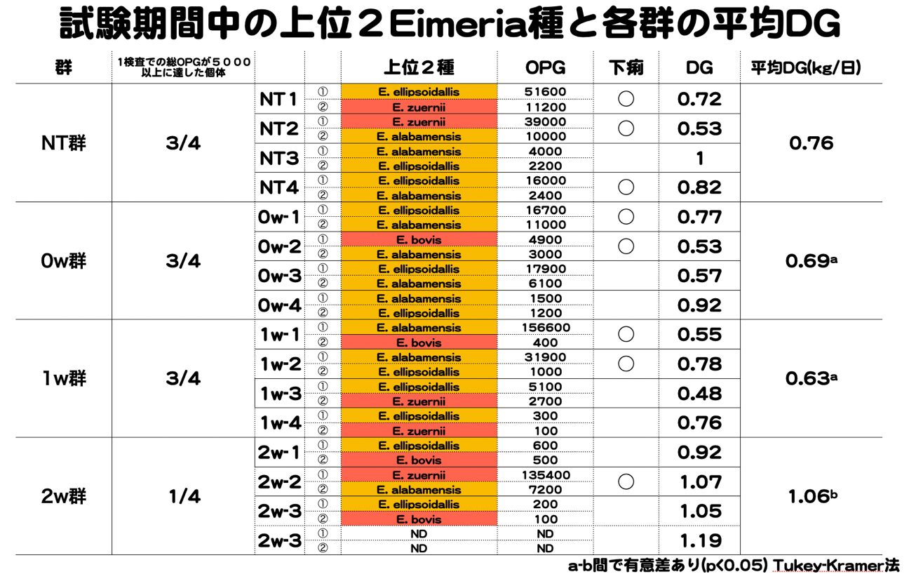図3 試験期間中に検出されたコクシジウムの種類と各群の平均DG