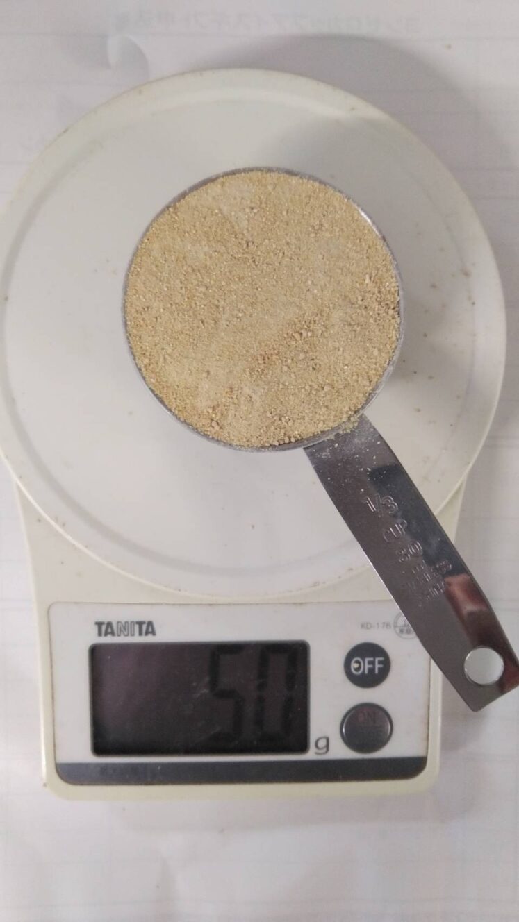 うちでは、推奨量が50gのビタミン製品を使用しています。搾乳牛達には、推奨量の50g(70mlの計量カップにすりきり)を給与していました。