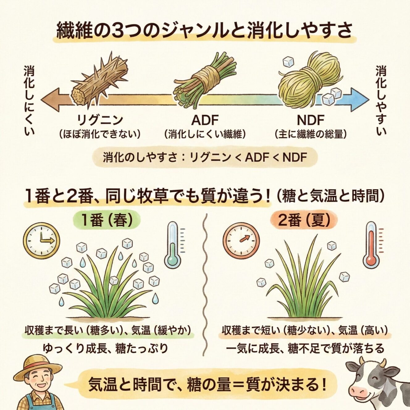 なぜ1番と2番、同じ牧草で差が出るのかというと、これも「夜の呼吸量」が関係します。 原理はまったく同じです。 関連するのは「糖」「気温」「収穫までの時間」です。