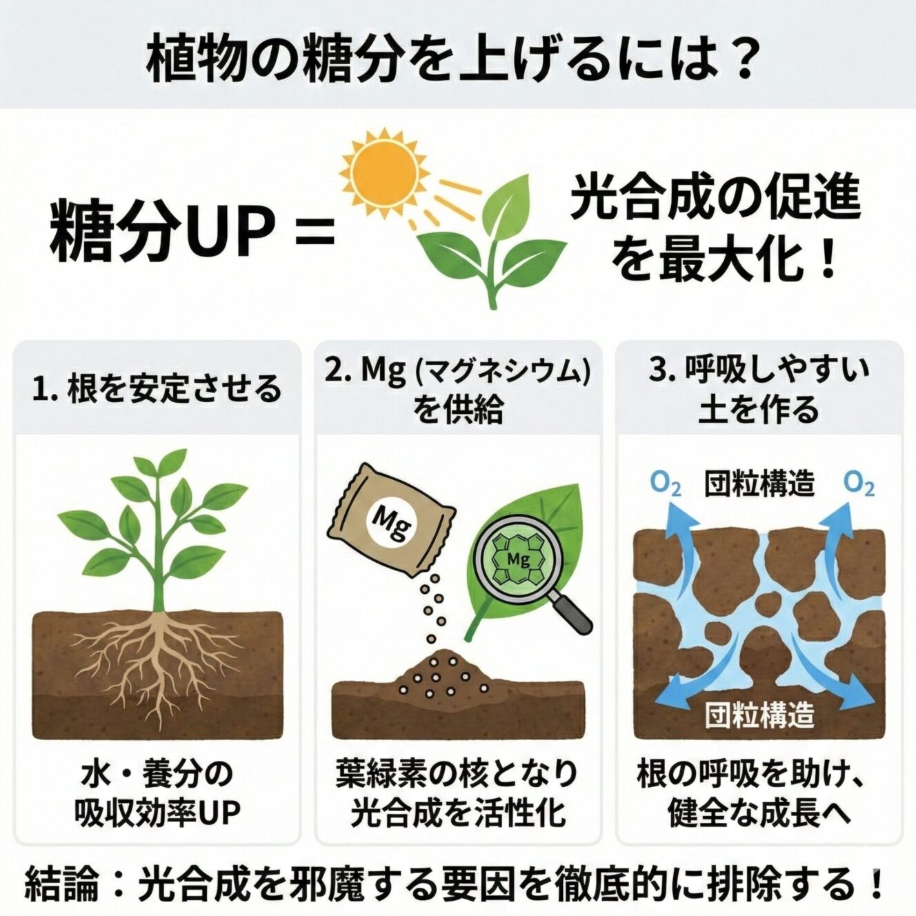 糖分はシンプルです。光合成の促進を最大化させてあげることですね。