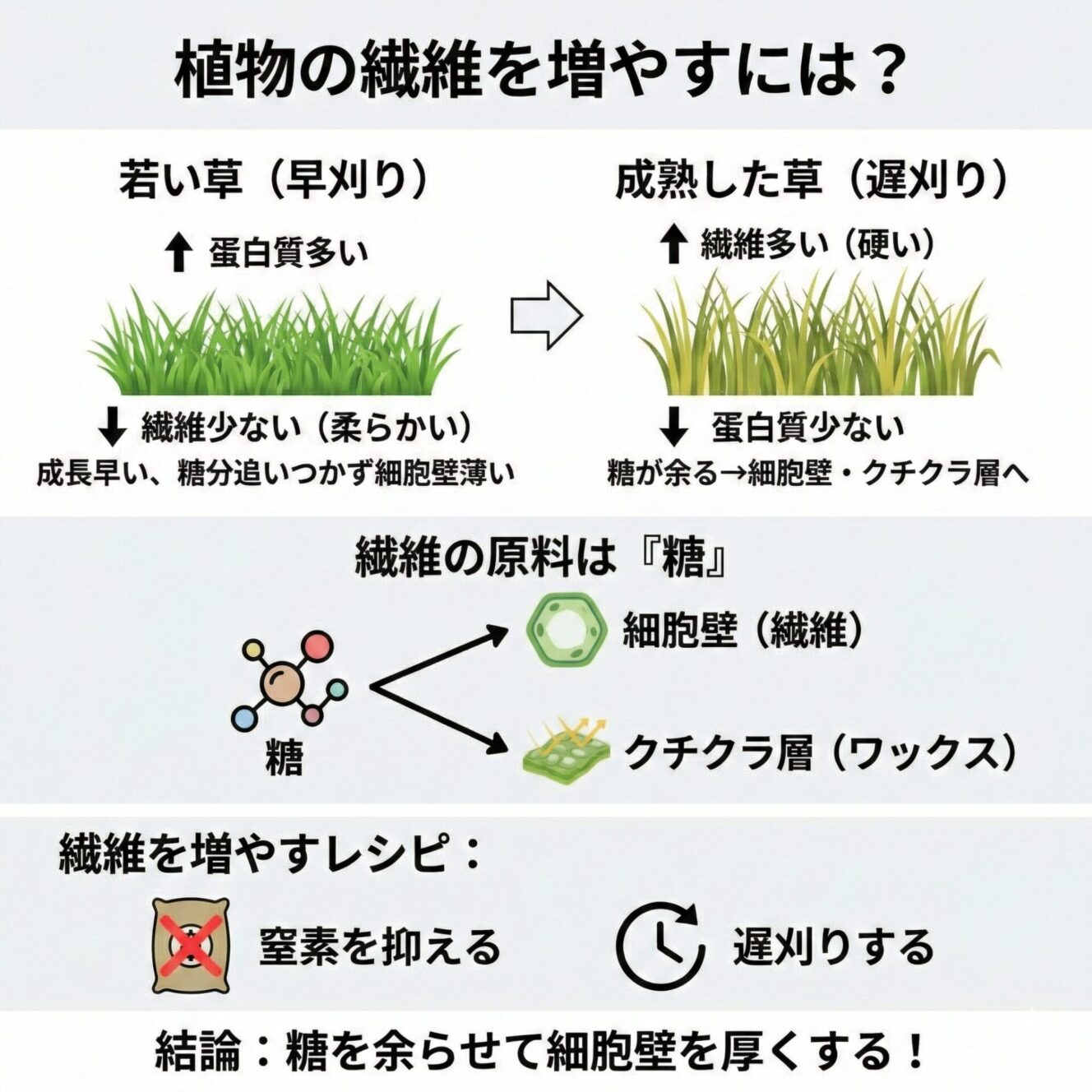 繊維を上げるのなら、窒素を抑えて遅刈りする。これで繊維が増える条件が整っていくと思います(消化されにくい繊維も増えていきますが…)。