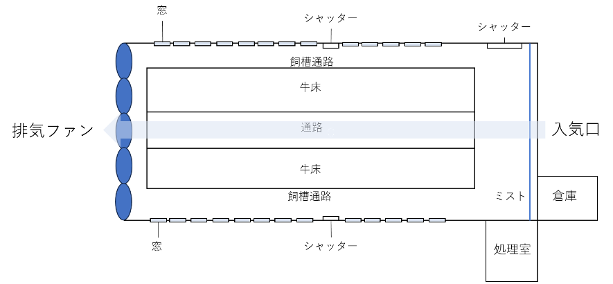 トンネル換気の場合、側面の窓などはきっちり閉め、余計な空気が抜ける・入ることが無いよう管理することが鉄則です。しかし、この牛舎では、処理室の位置関係から、入気口をまっすぐかつ十分に確保することが難しかったため、側面の窓も開放し、不足分の入気口を確保しているとのことでした。原則とは少し離れますが、既存の牛舎でできる最大限のことを模索した結果とのことです。